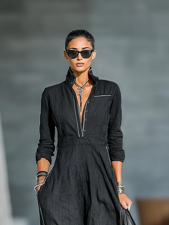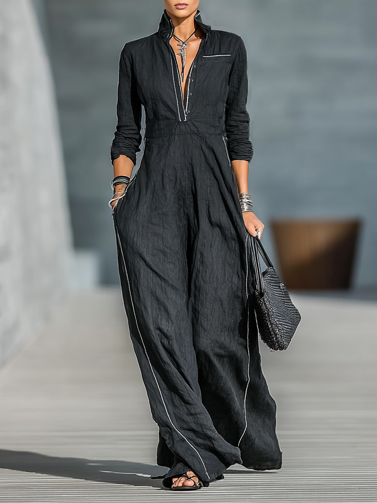 Women's Cotton And Linen Blend White Trim Button Stand Collar Maxi Dress MDA0702H2Y