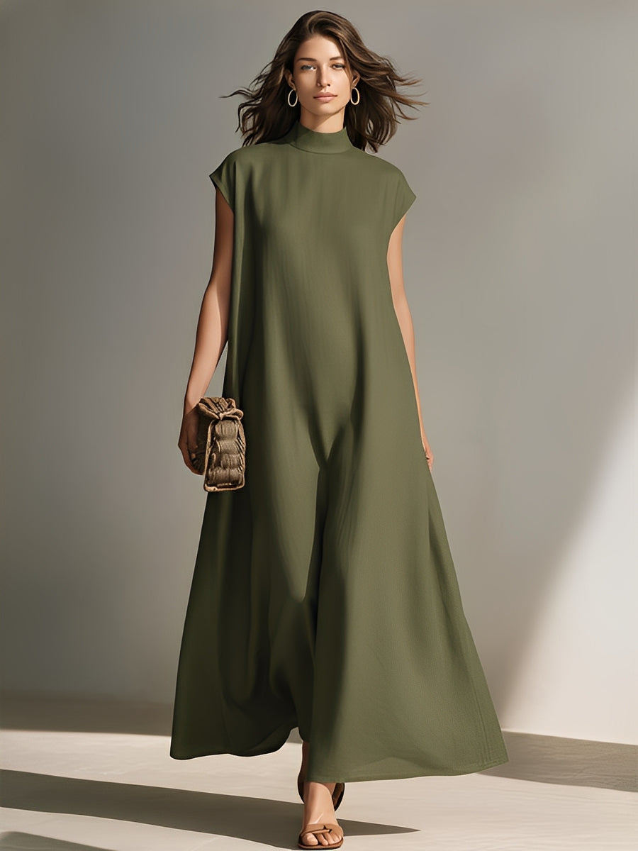 Women's Olive Green Textured Dress With Mock Neck & Sleeveless Silhouette, Timeless Minimalist-Elegant Style Dress MDZ1621A2I
