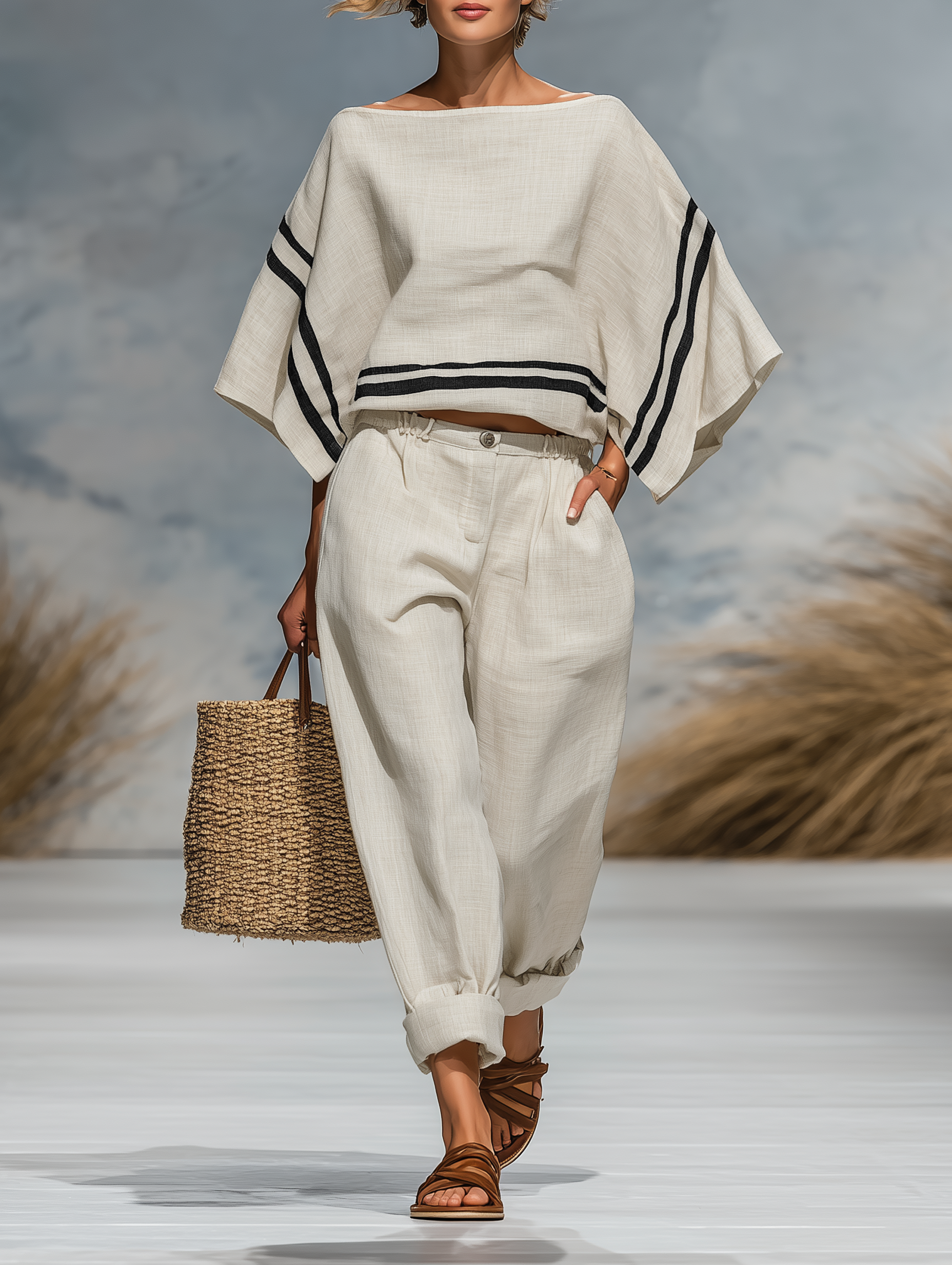 Women's Minimalist Linen Blend Batwing Sleeve Blouse And Trousers Set MDZ1609A7Y