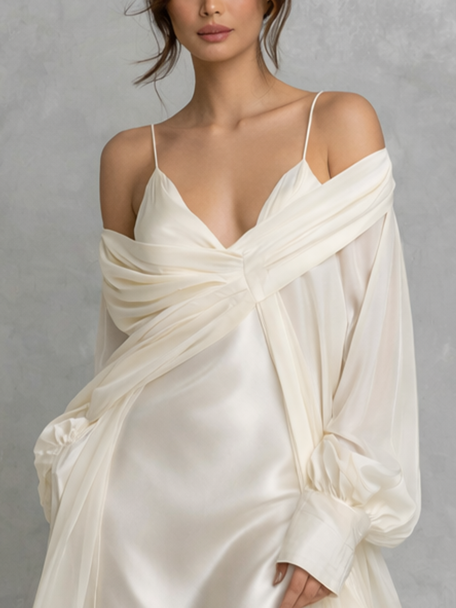 Elegant Women's White Satin And Chiffon Off-the-shoulder Midi Dress With Spaghetti Straps MDZ1599A0BA