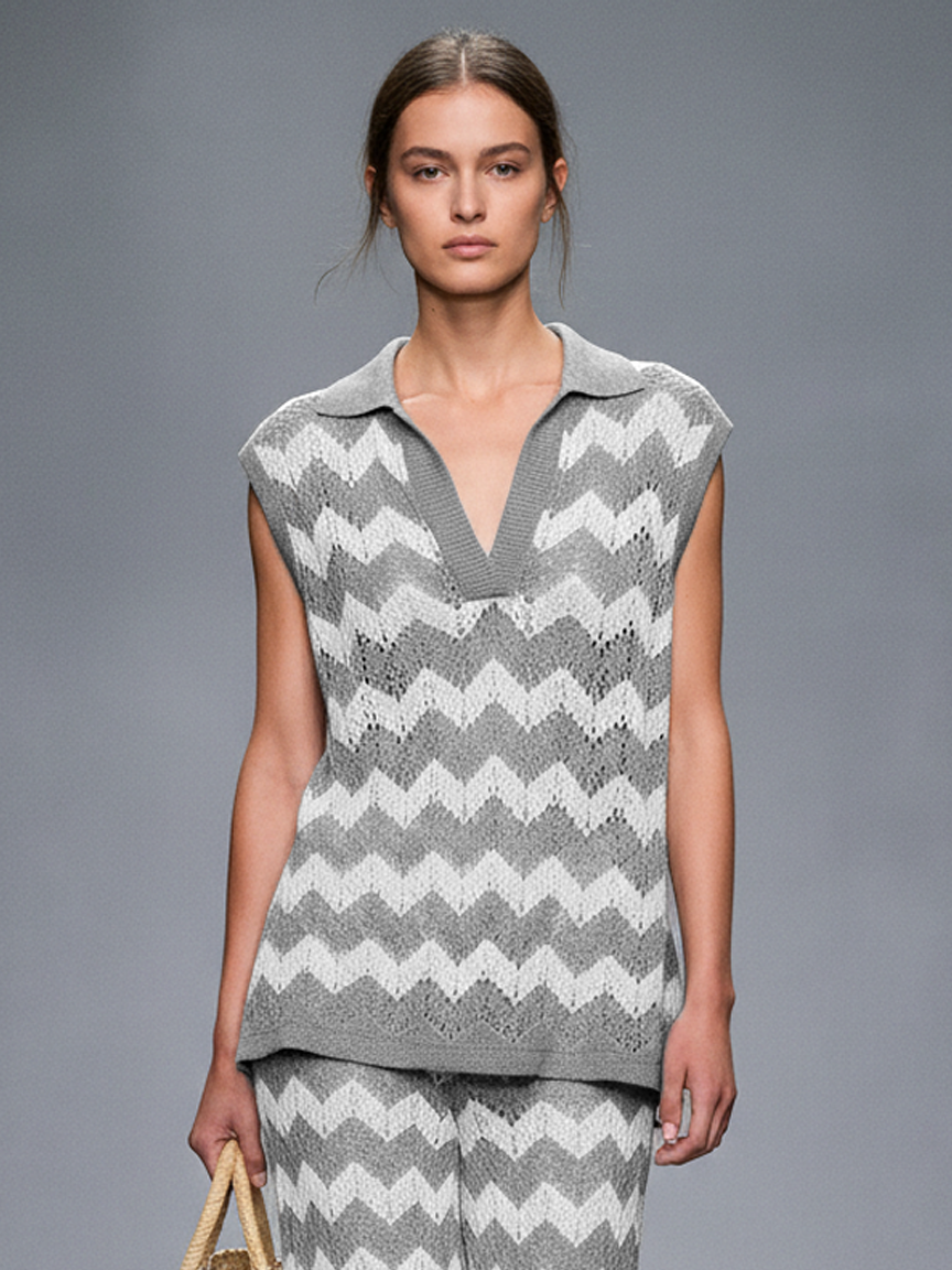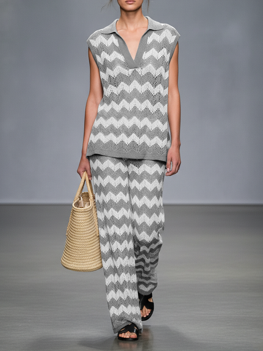 Women's Sheer Wave Pattern Knitted Sleeveless Top And Straight-leg Pants Set MDZ1407A0Y