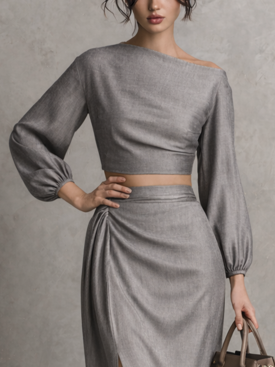 Women's Premium Gray Woven Twill Fabric Off-the-shoulder Top And Slit Skirt Set MDZ1586A6BA