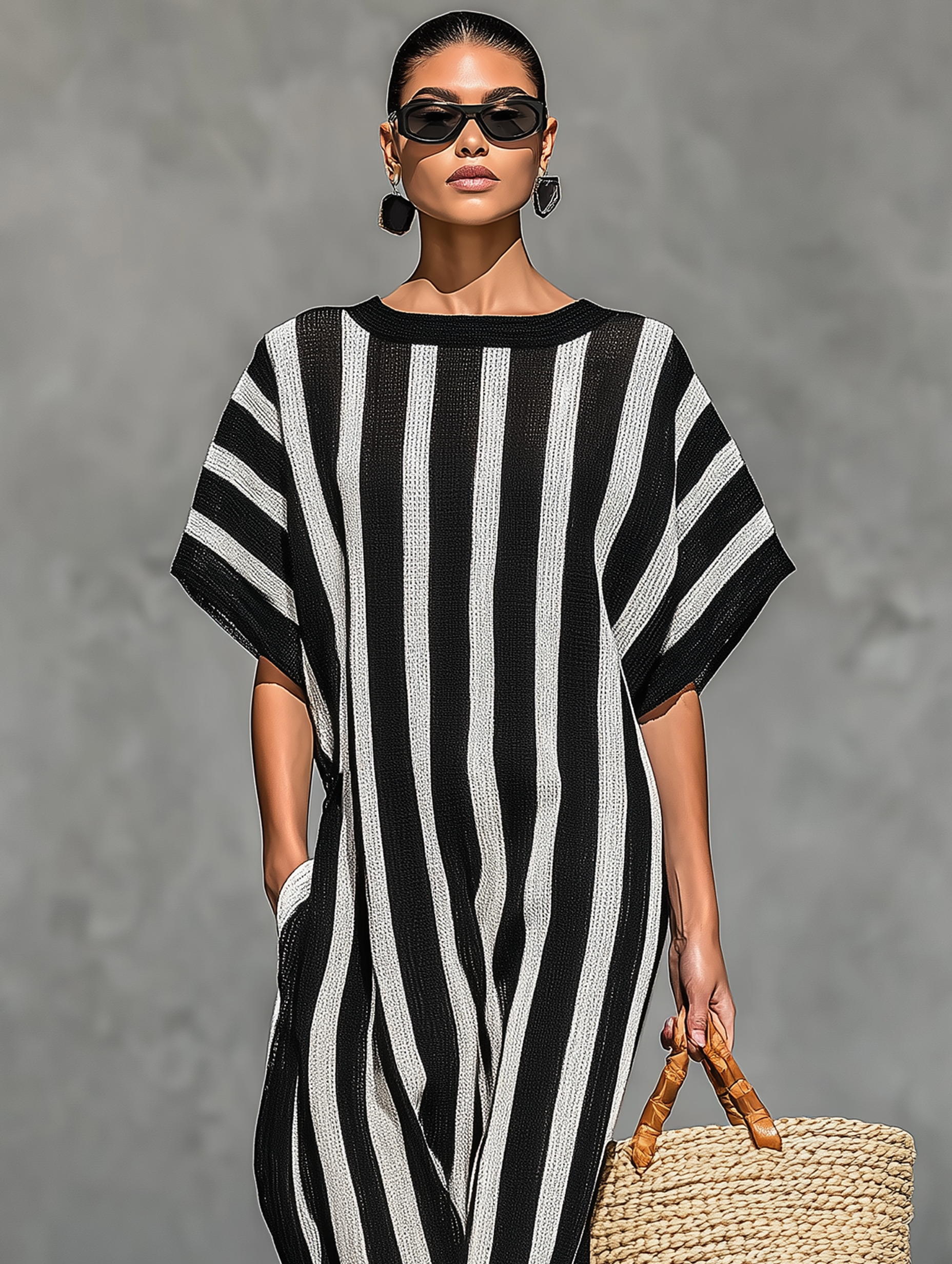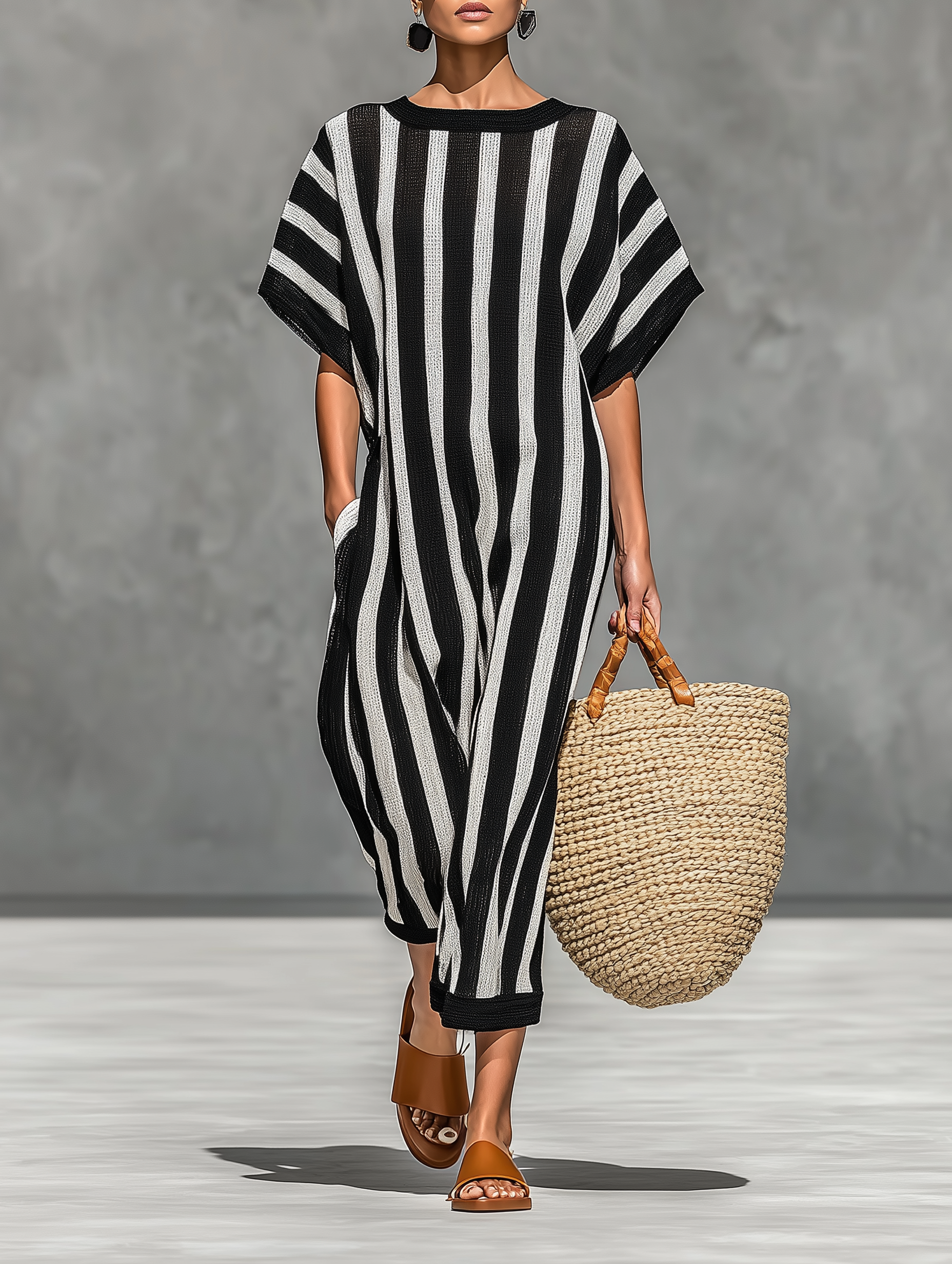 Women's Minimalist Black And White Striped Knitted Sheer Jumpsuit MDZ0911A4Y