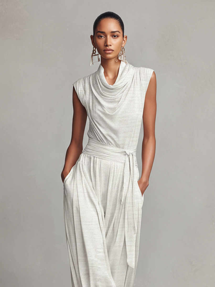 Women's Light Gray Textured Knit Jumpsuit With Cowl Neck & Belted Waist, Timeless Luxe-Elegant Style Jumpsuit MDZ1394A3I