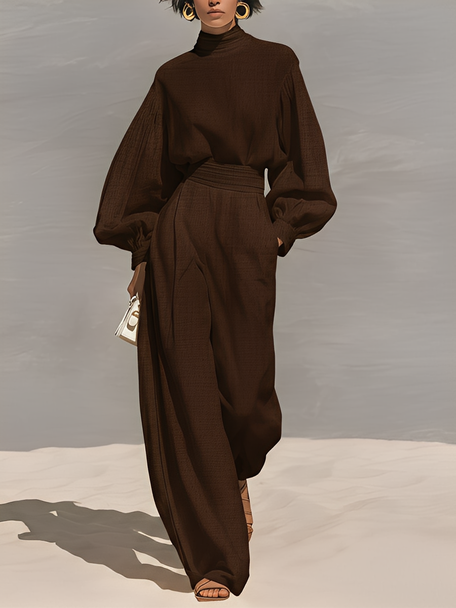 Women's Chocolate Woven Set With Puff Sleeve Turtleneck & Wide-Leg Pants, Timeless Luxe-Chic Style Set MDZ1509A3I