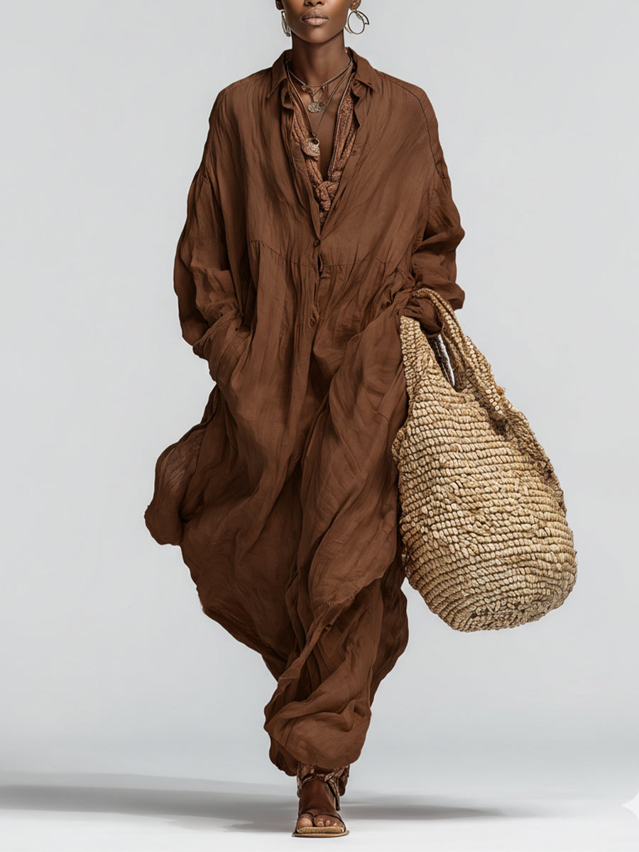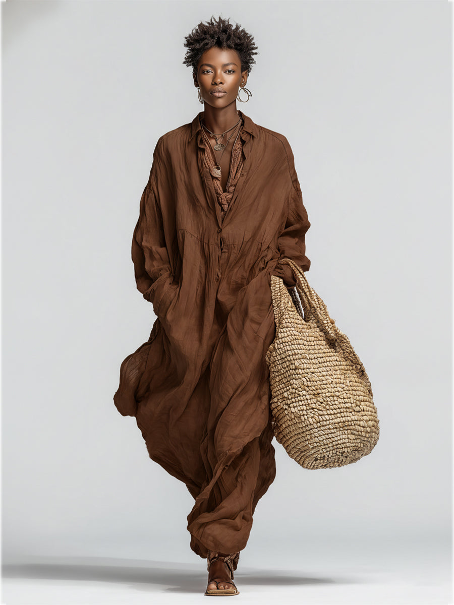 Women's Chocolate Linen Dress With Relaxed Silhouette & Long Sleeves, Timeless Boho-Casual Style Dress (Inner lining not included) MDZ1618A8I