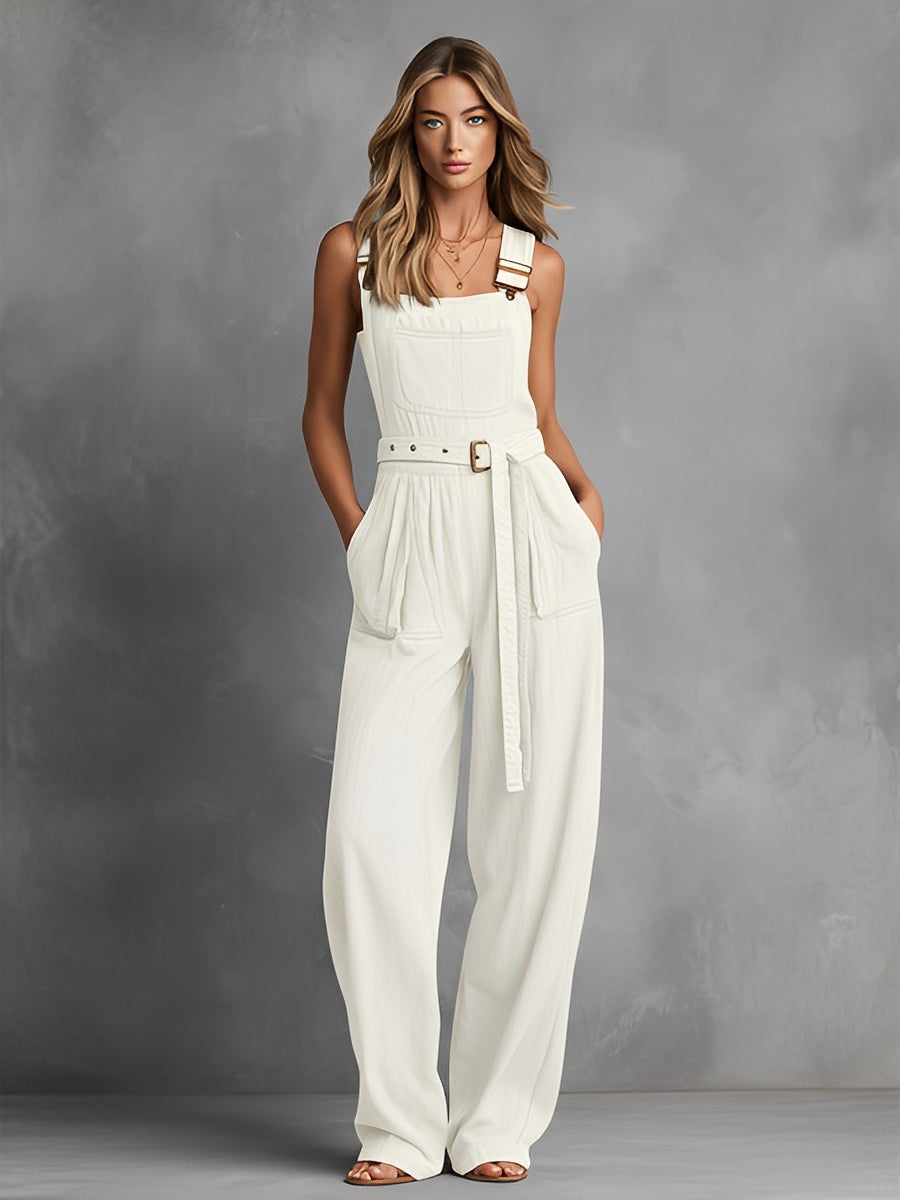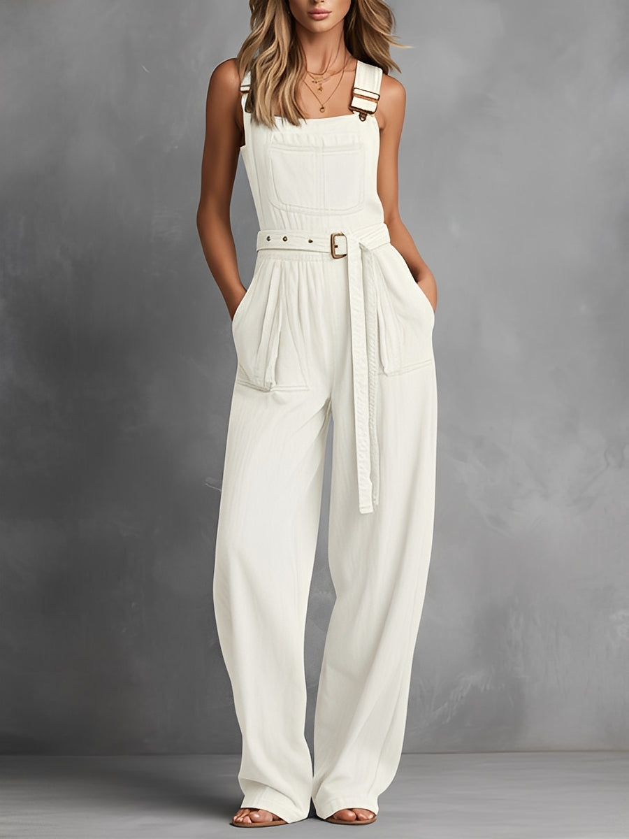 Women's Off-White Relaxed Jumpsuit With Utility Pockets & Adjustable Straps, Sophisticated Daytime-Casual Style Jumpsuit MDZ1473A6I