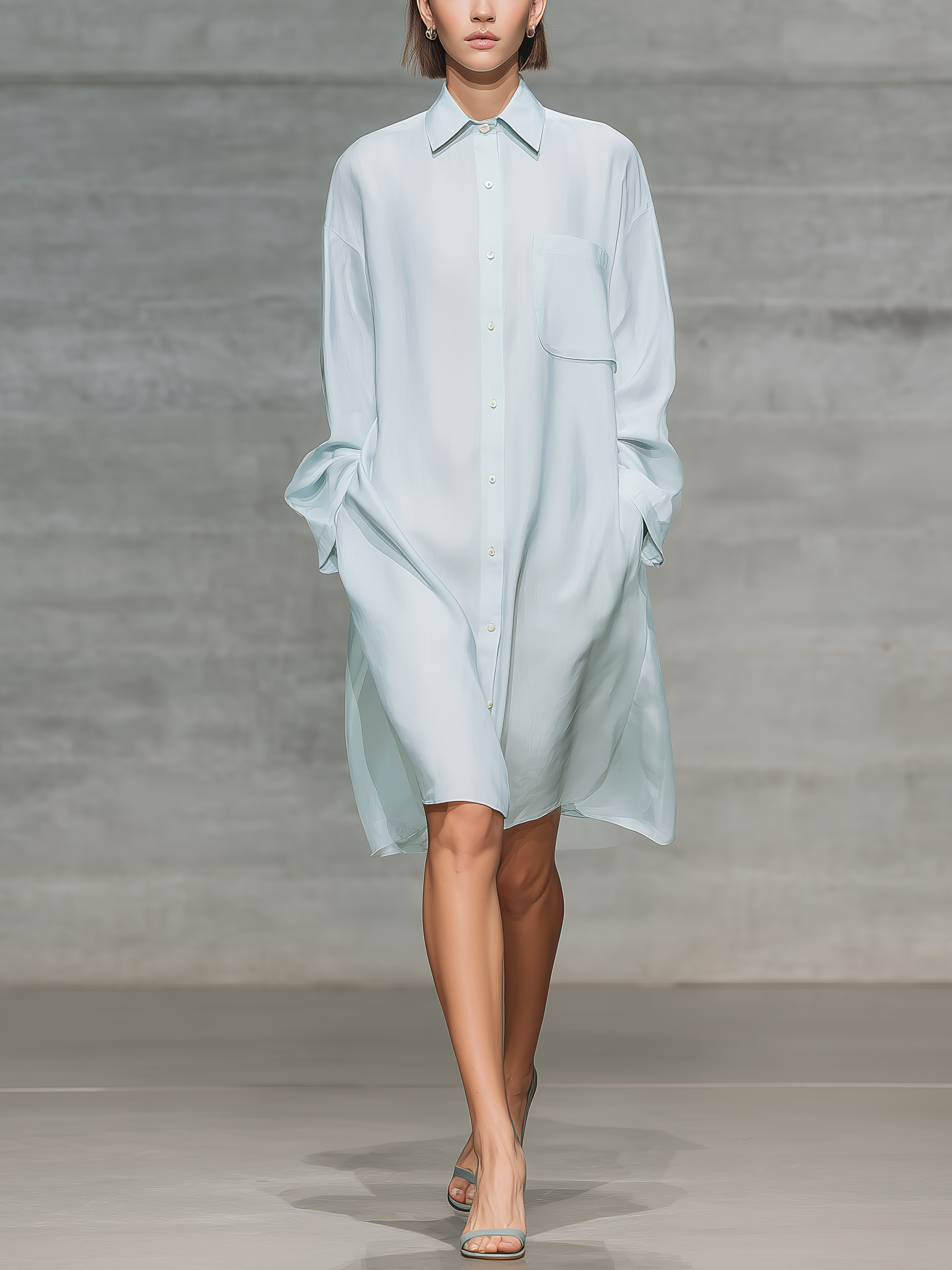 Women's Elegant Light Blue Chiffon Loose-fitting Long-sleeved Shirt Dress With Lining MDA3082L9AN