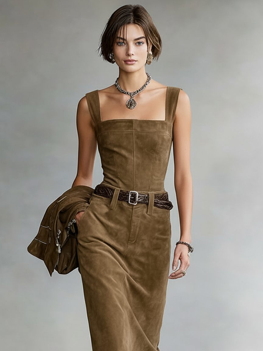 Women's Minimalist Faux Suede Wide-strap Belted Midi Dress MDZ0520A4Y