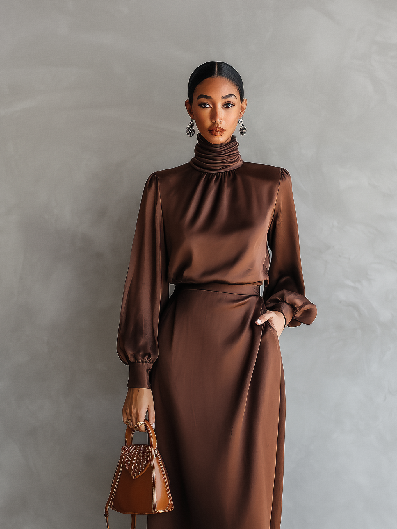 Women's Elegant Brown Satin Round Neck Long Sleeve Loose Midi Dress MDA2301L2AN