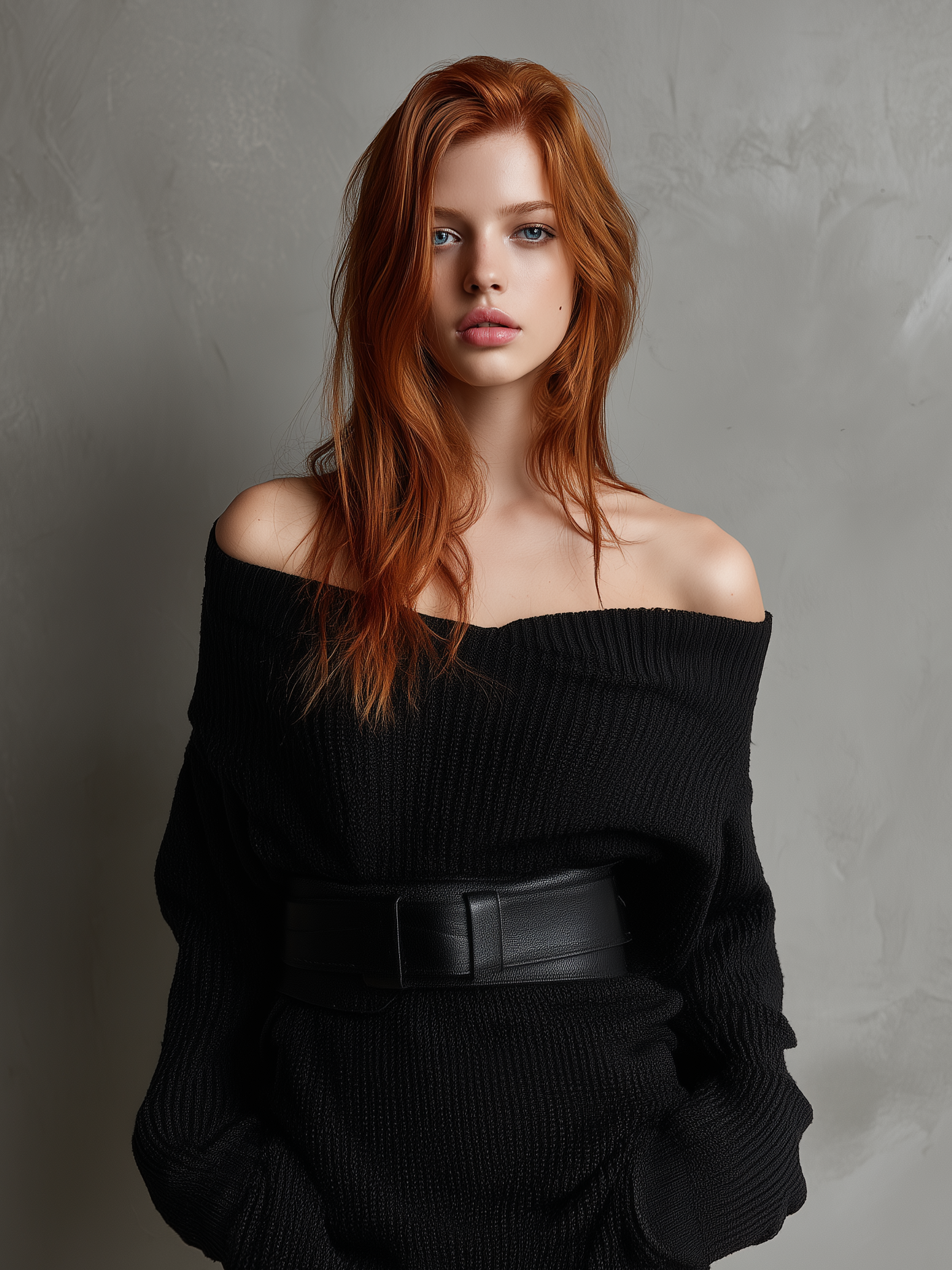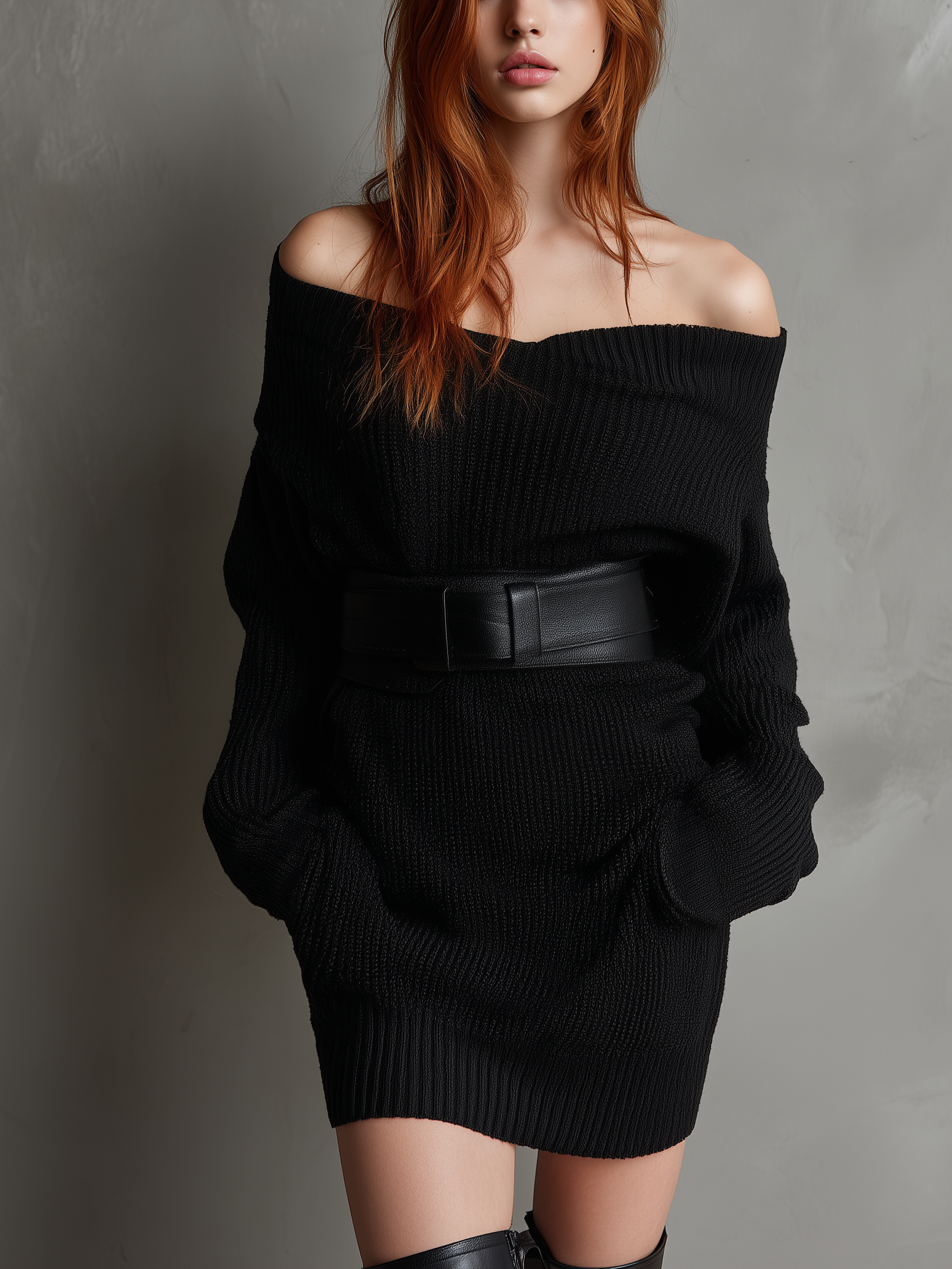 Women's Elegant Black Knitted V-neck Off-the-shoulder Long And Short Dress (belt Not Included) MDZ1561A4AN