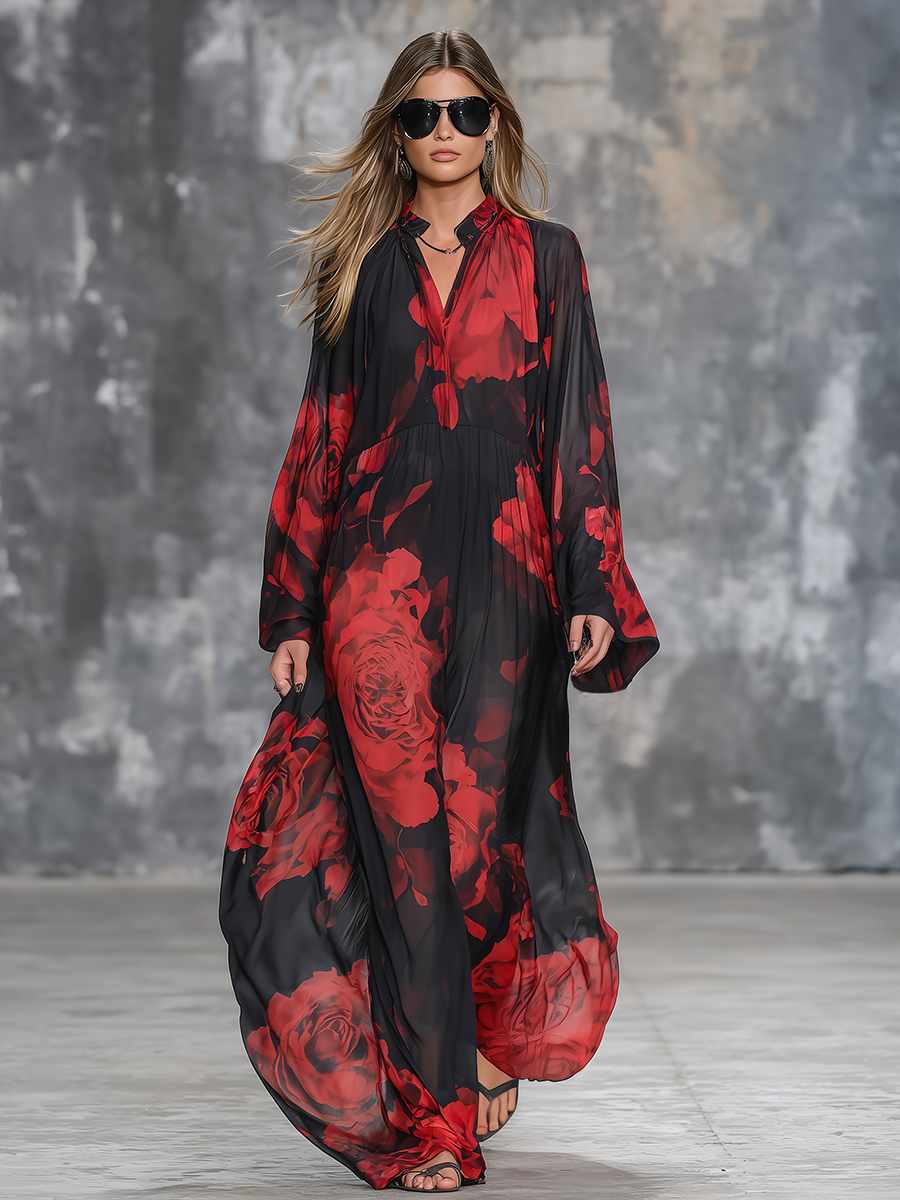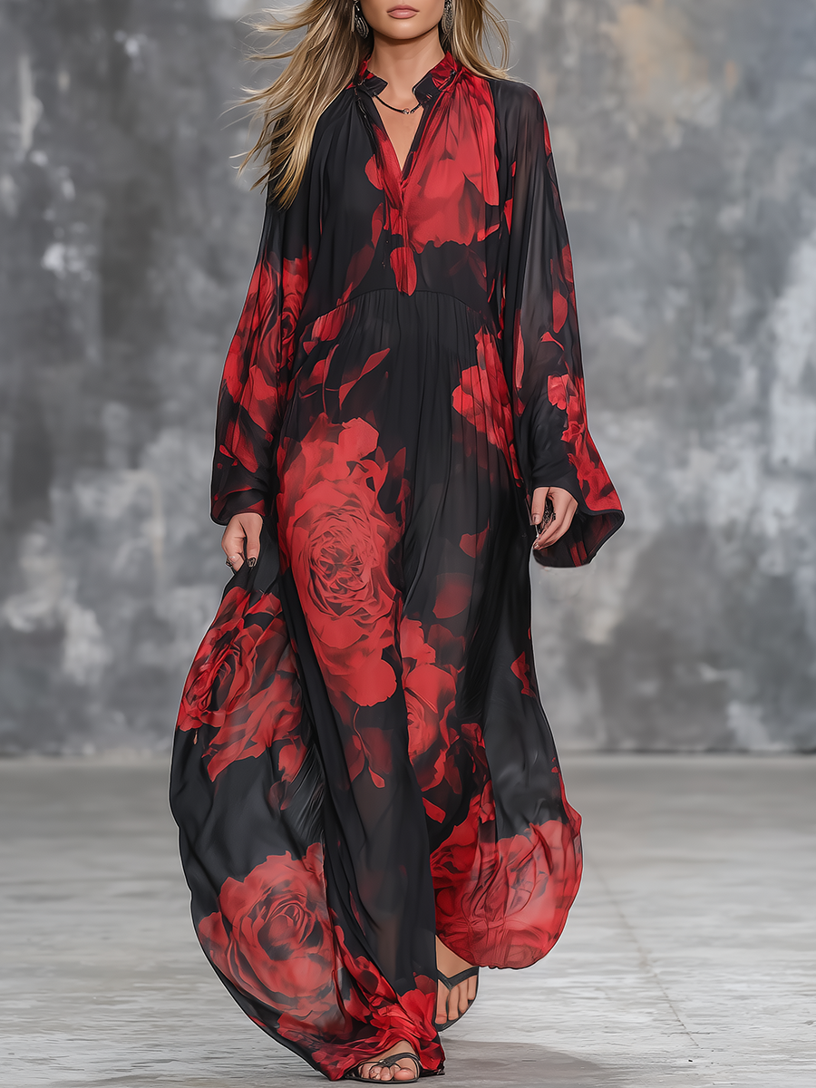 Vintage-style Oversized Floral Print Chiffon Maxi Dress