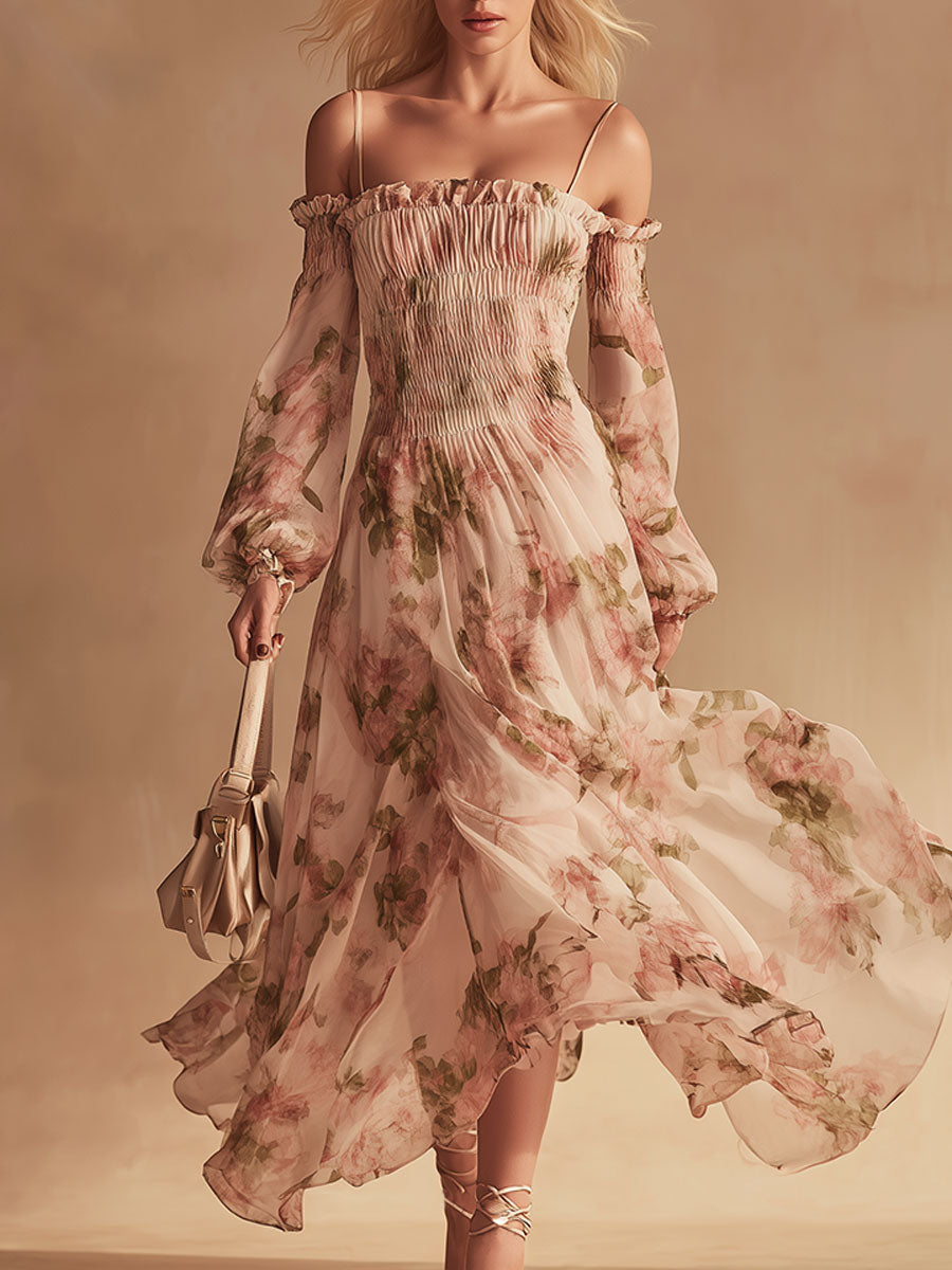 Stylish And Elegant Off-the-shoulder Floral Print Pink Chiffon Maxi Dress