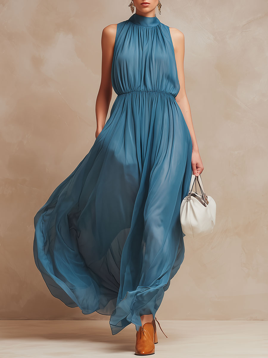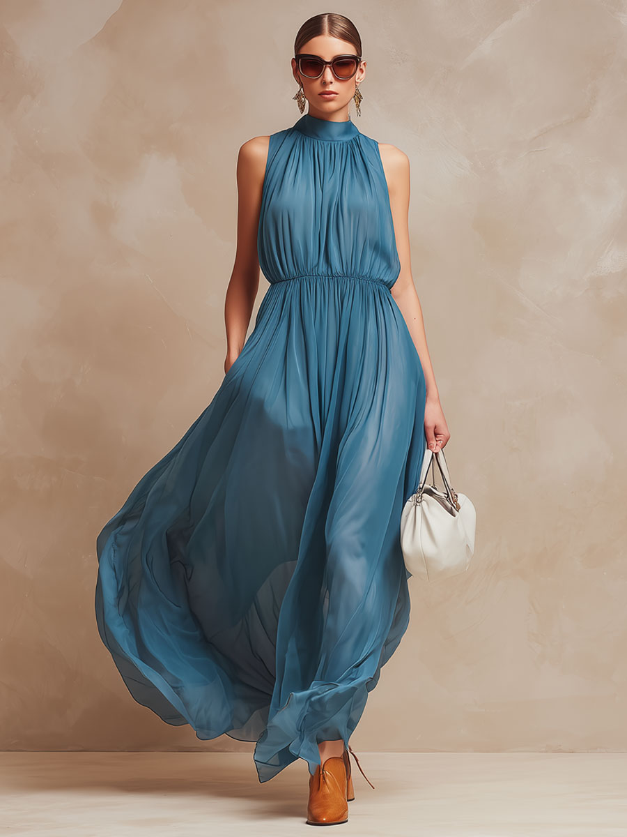 Stylish And Elegant Resort-style Lake Blue Chiffon Sleeveless Maxi Dress