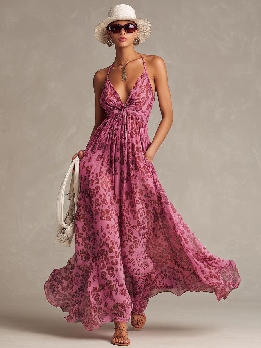 Stylish And Elegant Hot Pink Zebra Print Chiffon Halter Neck Sleeveless Maxi Dress