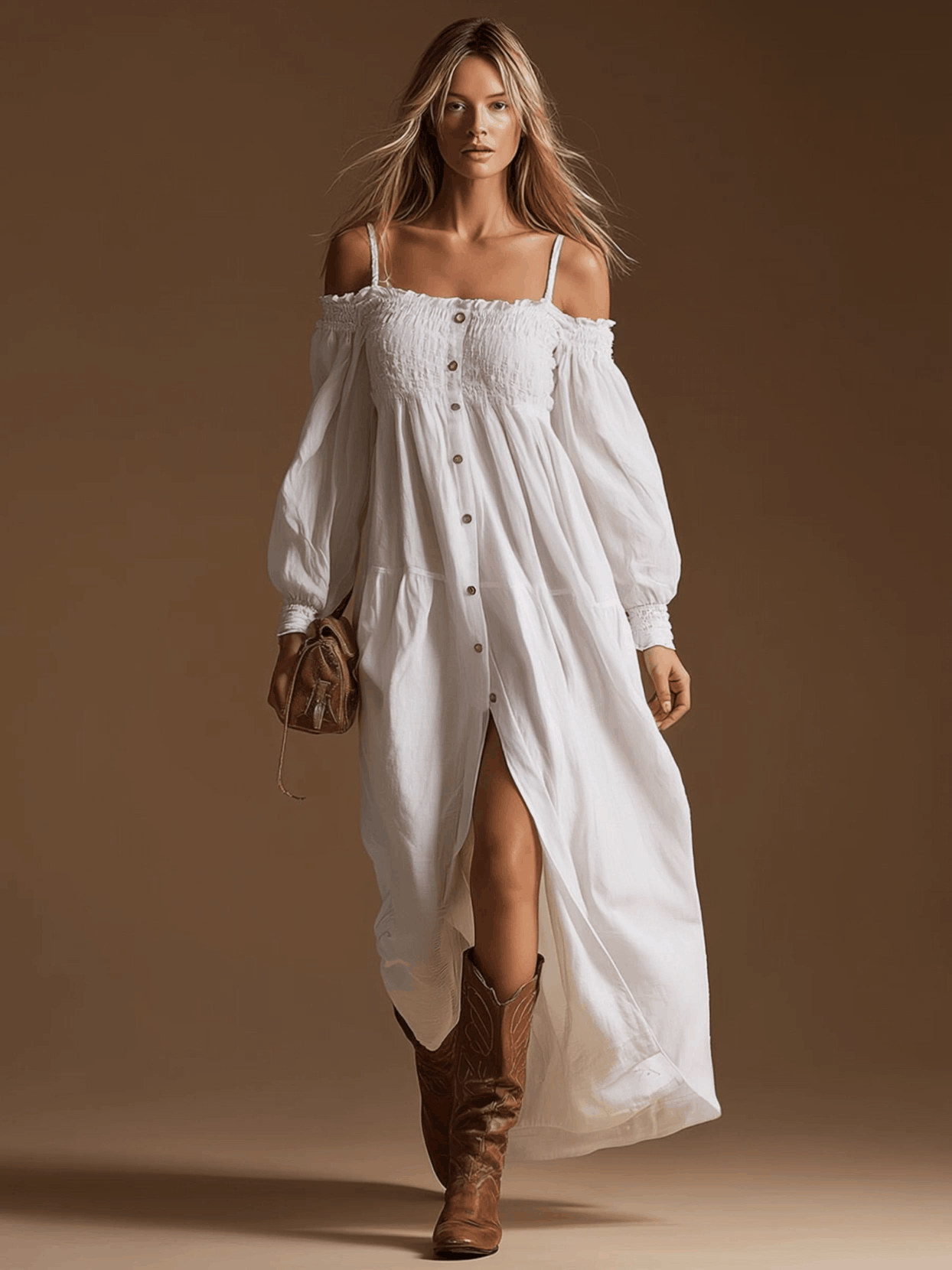 Stylish And Elegant White Cotton And Linen Off-shoulder Spaghetti Strap Maxi Dress