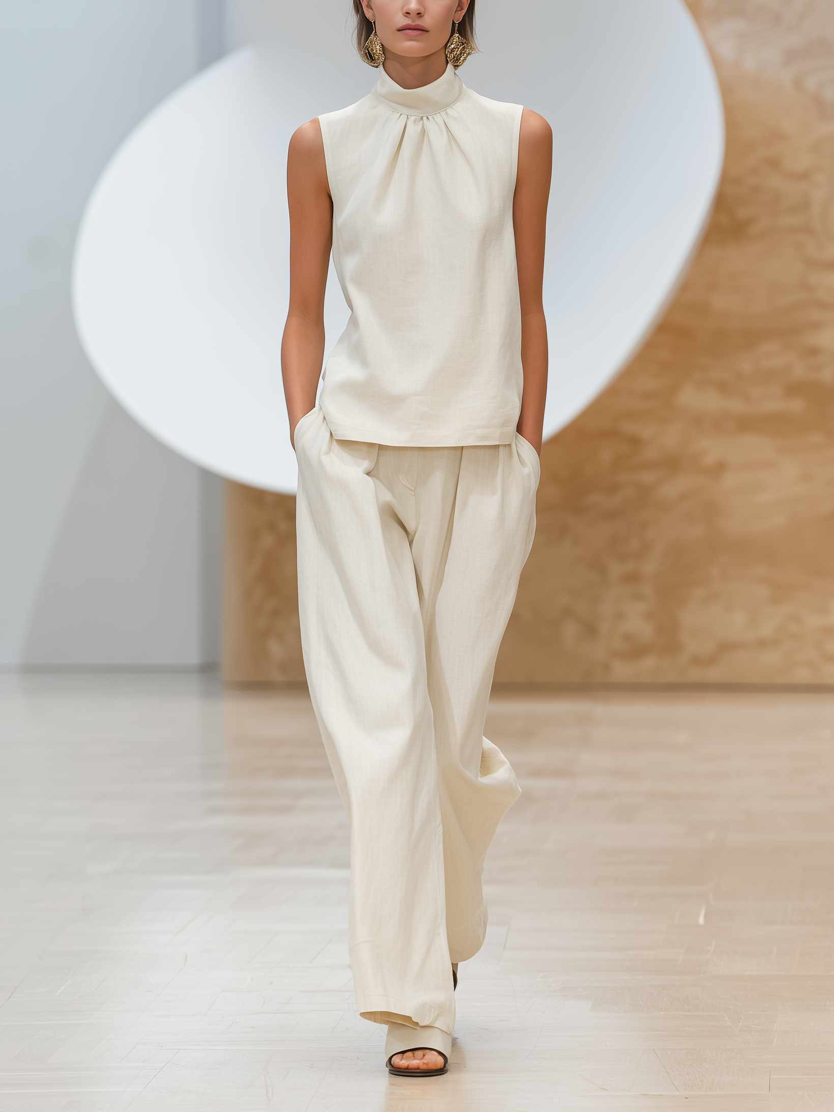 Women's Elegant White Cotton-linen Blend High-neck Sleeveless Top And Trousers Set MDZ0927A9AN