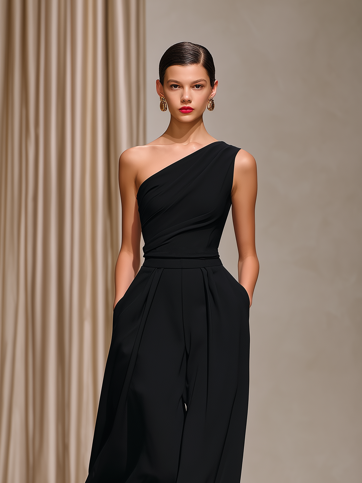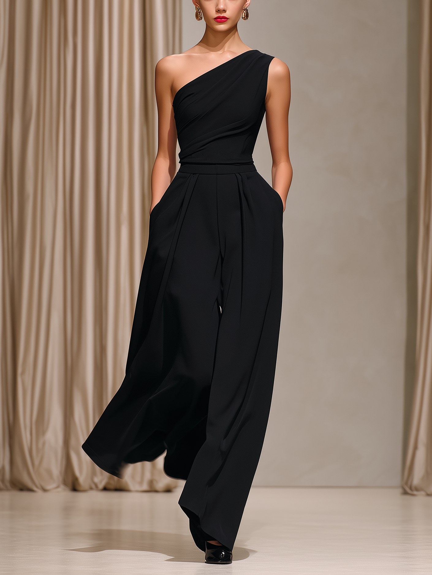 Women's Elegant Black Stretchy Knit Sleeveless One-shoulder Top And Wide-leg Pants Set MDZ0515A4AN