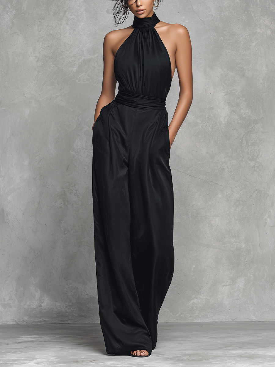 Women's Elegant Black Acetate Double-sided Satin Halter Jumpsuit MDZ1549A0BA
