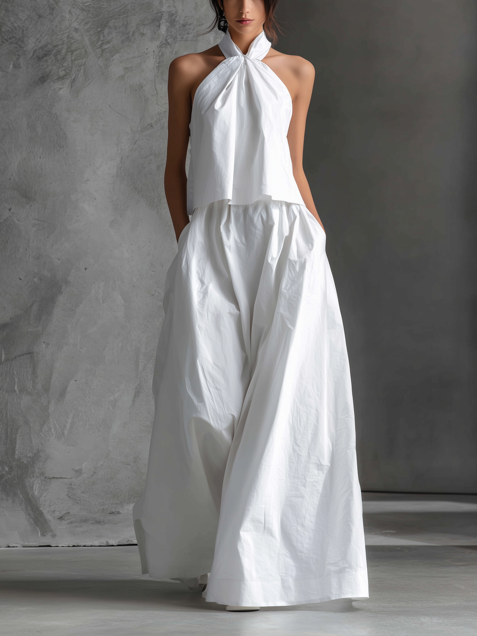 Women's Casual White Cotton And Linen Halter-neck Sleeveless Top And Skirt Set MDZ1269A6AN