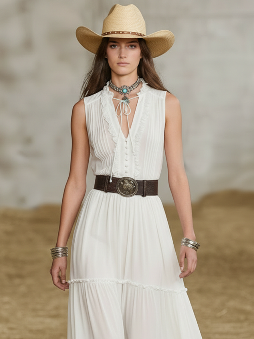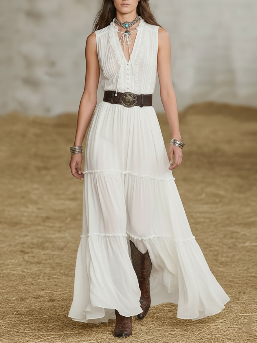 Women's Minimalist Linen-blend Sleeveless Maxi Dress With Ruffle Details MDZ1622A0Y
